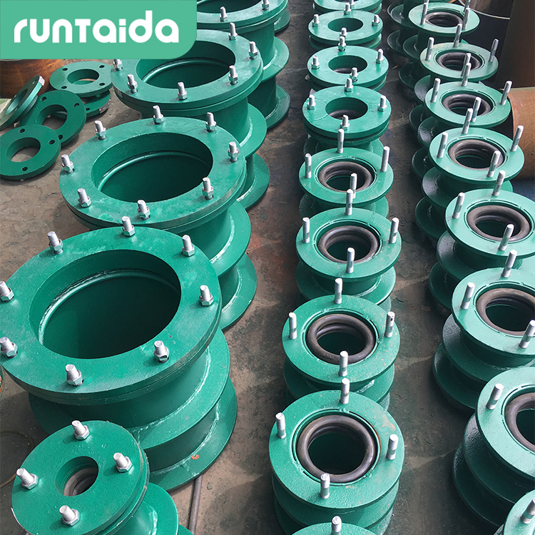 柔性防水套管主要由:法蘭套管、密封圈、法蘭壓盤(pán)、翼環(huán)、螺栓、螺母組成,結(jié)構(gòu)復(fù)雜。一般是鋼管外面焊上3道翼環(huán),一面有4個(gè)螺絲扣,里面焊一個(gè)擋片,加上一個(gè)膠圈,外面再做一道法蘭盤(pán),加4個(gè)雙面螺栓,頭上焊一道鋼管,把管道安上以后,把法蘭安上,把螺絲緊固,越緊膠圈越大,越不漏水,一般在防水要求比較高的地方用,比如水池出水口。不僅有防水要求,還有防振、防位移要求時(shí),則使用柔性防水套管:由上可知,二者的構(gòu)造上有差異。對(duì)于相同規(guī)格的這二種防水套管來(lái)說(shuō)柔性防水套管要復(fù)雜些,因此也就