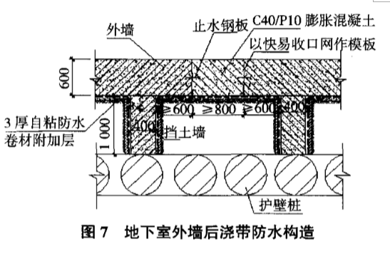 因地下室每施工完成一層并做好防水后,需對(duì)外墻進(jìn)行回填,而地下室側(cè)墻后澆帶則需在兩側(cè)混凝土結(jié)構(gòu)澆筑60 d后補(bǔ)澆C35/P10膨脹混凝土,所以施工時(shí),在外墻后澆帶外大于600 mm處澆筑400 mm厚混凝土擋土墻,使400 mm厚擋土墻正對(duì)護(hù)壁樁,擋土墻配筋10@200,水平筋一端錨人地下室外墻,另一端植筋植入護(hù)壁樁中?;靥钔燎皯?yīng)先將擋土墻外側(cè)防水施工完成,待外墻后澆帶混凝土澆筑后再施工擋土墻內(nèi)側(cè)防水。具體施工,見(jiàn)圖7。