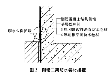 底板部位的卷材與永久性保護墻的接觸部位應(yīng)空鋪或適當點粘(以適應(yīng)結(jié)構(gòu)的不均勻沉降),永久性保護墻頂面預(yù)留甩茬的卷材上面蓋兩皮磚進行臨時保護,待二期接茬時拆掉臨時保護墻,與外墻卷材進行搭接。側(cè)墻二期防水卷材接茬示意見圖2。