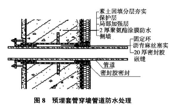 穿過防水層的側(cè)墻管道預(yù)理套管,套管中間焊接止水鋼板,管道安裝完成后,用瀝青麻絲塞實(shí),兩端用防水密封膏密實(shí),迎水面設(shè)附加雙組分聚氨酯涂膜防水層一道,局部加強(qiáng)層涂刷并用胎體增強(qiáng)(轉(zhuǎn)角處)。具體處理,見圖8