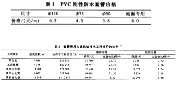 建筑施工給排水工程施工說(shuō)明規(guī)定:管道穿越樓面、屋面、水箱,需預(yù)埋剛性防水套管。工程實(shí)踐表明,防水套管在一定程度上能夠解決衛(wèi)生間樓板的滲水問(wèn)題。而剛性防水套管可以解決滲漏問(wèn)題,但是費(fèi)用也不低,PVC剛性防水套管價(jià)格見(jiàn)表1,防水套管費(fèi)用占建筑給排水工程造價(jià)的比例見(jiàn)表2。