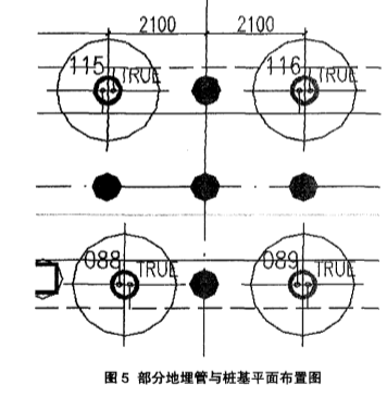 供、回水分別集中到單獨的分、集水器上。水平聯(lián)絡管采用De63、De75PE管,整個土壤換熱器系統(tǒng)按同程方式連接,確保各換熱孔內循環(huán)液的流量、流速一致,為系統(tǒng)的安全運行提供可靠的保障。部分地埋管與樁基平面布置如圖5所示。